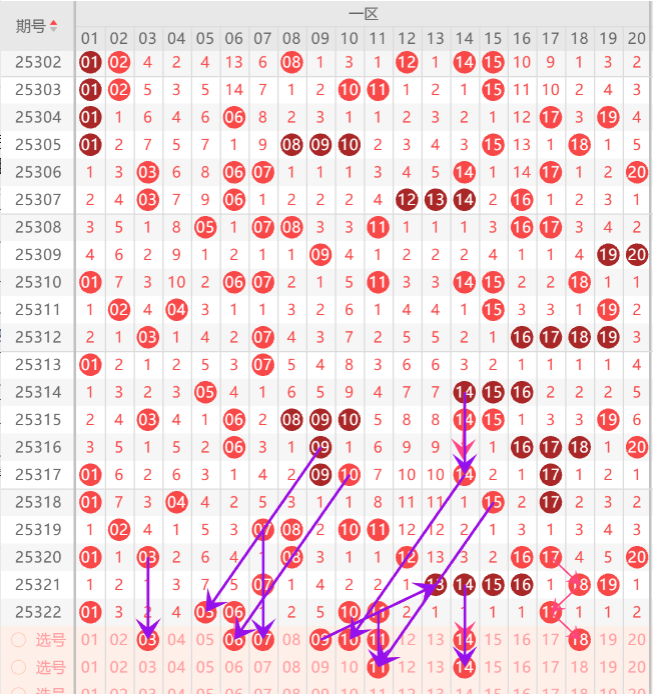 一区在近期的走势分析,近期一区间是温冷形态,上期一区间再次开出了6码,而且上期区间开出的形态是空位回补和斜连号走势,上期小妹在文中布局到了4码开出,那么本期一区间重点关注的形态是对称形态,隔期回补,重码走势,那么本期首先注意对称形态上的03.09.14.中开出1-2码机会,而隔期回补上注意07.14.19中开出1-2码回补机会,至于重码走势上注意06.11.10中开出一码走重机会,如图所示。