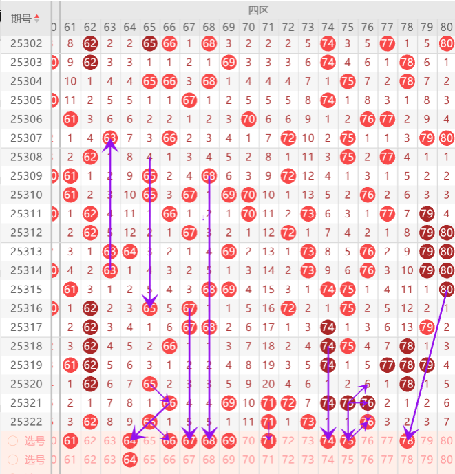 四区在近期的走势上来判断机会的话,整体区间是温热形态,上期四区间区开出了5码,而且上期区间开出的形态是重码和重码回补走势,上期小妹在文章中布局到了2码开出,那么本期四区间重点关注的形态是斜连号走势,对称形态,隔期回补,那么本期首先要注意斜连号下拉位置上的64.74.77中开出一码下拉机会,而对称形态上注意61.68.69.75.号中开出1-2码机会,至于隔期回补上注意66.69.74.75中参考1-2码机会,如图所示。