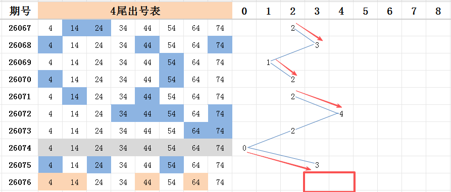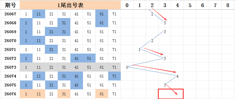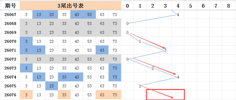 本期看好开出的范围是两码走势至四码走势之间。三尾上期开出一码走势,号码33是四斜连的号码走势,属于本尾比较有规律的号码走势,如果本尾能开出多码走势,那么有规律的号码大概率会开出。看好两个尾码:号码63和号码73能够再次开出其中一码。