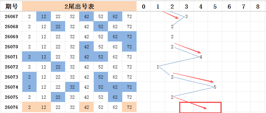 本期看好开出的范围是两码走势至四码走势之间。上期二尾开出两码走势,号码12是三斜连的号码走势,属于本尾比较有规律的号码走势,如果本尾能开出多码走势,那么有规律的号码大概率会开出。号码72同样是三斜连的号码走势,属于本尾比较有规律的号码走势,如果本尾能开出多码走势,那么有规律的号码大概率会开出。看好两个首码能够开出其中一码。