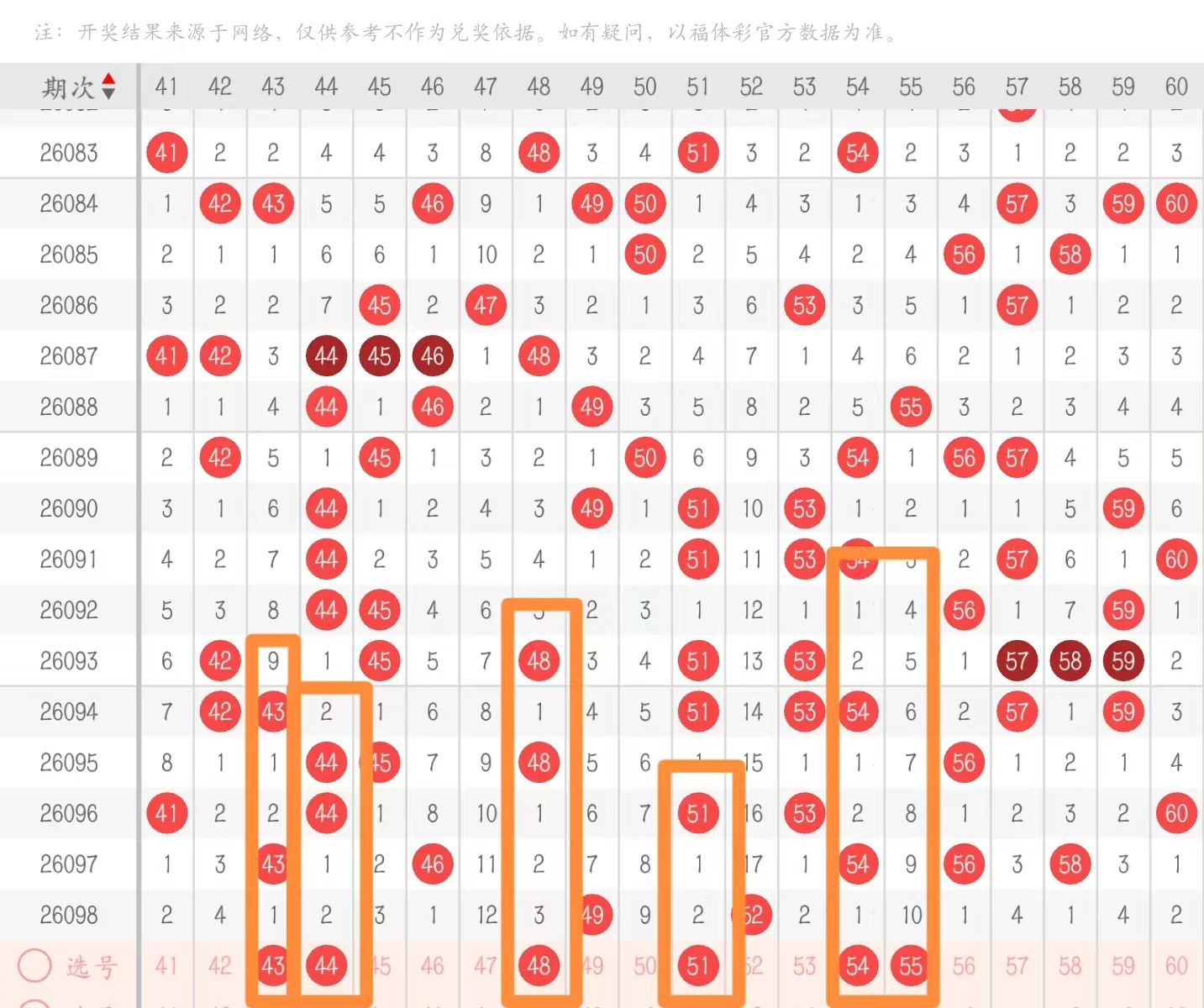 三区41—60:在三区的小优势点位上面大家可以去做号码的回落情况,目前跨度在4字头和5字头体现的比较大,那么他们这两头都可以做对子的落位回补,然后斜连的遗漏顺子,123底下我们应该保留1~2码都可以,所以说这三码的话,如果不打对子的话,可以单拿45,如果打对子的话就要考虑43 44只选一码去搭配45。49的孤码包括52的孤码,我们至少有一边要去考虑分边的,所以48 51这两码都是不错的选择点,然后50 55的梅花一个空91个空10个人觉得还是去考虑大一路的55,毕竟它是个干净的斜连带拐。