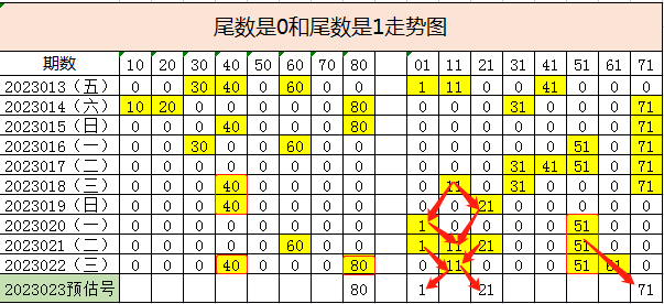 所以在尾数0和1区间,我个人觉得可以在80,1,21,71之间选二或者选三,当然近期的走势相当出其不意,大家也可以根据自己的喜好谨慎选择