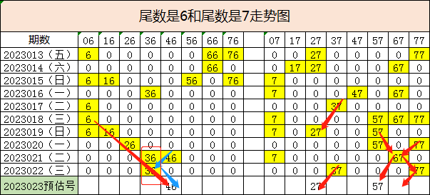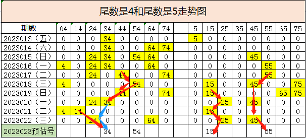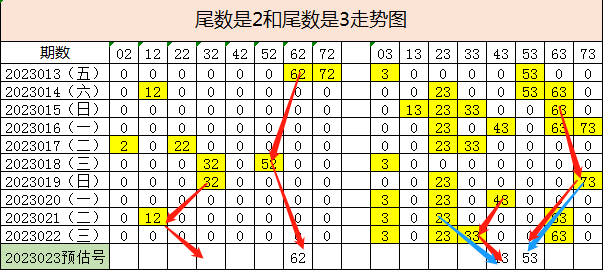 在020期的号码43和022的号码33落在本期的号码43上面可以形成一个不等边小三角,这里还有一个走势是021期的号码23和022期的号码33落在本期号码43上面可以形成一个斜开三连号的走势,所以这个号码还是值得关注的