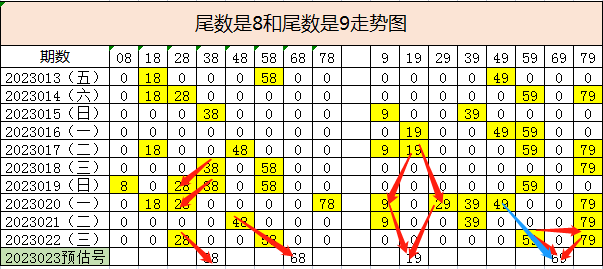 尾数9的走势可以看到一个小三角,还有一个隔一期不规则的斜号连号49,59,69,