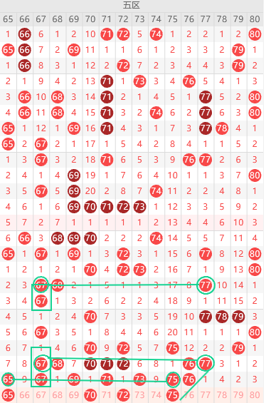 边号66 68 70 72 74 77出1-2码,重号65 75 73出一码,看上图勾画,出同尾号下一期走重一码,那么本期65 75二出一,其次7尾最热,77跟上面走势一样,完美复刻,本期67 77二出一,66到百期内最大遗漏值,防66,关注五码65 77 72 73 75防67