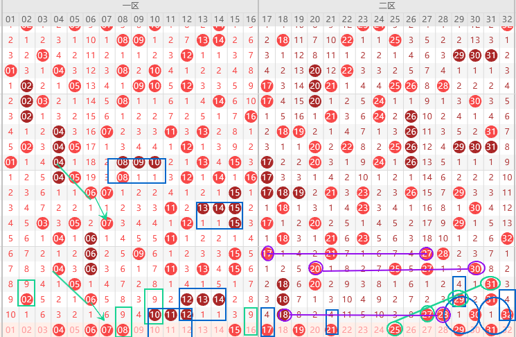 这个区间不连热,上期开出5码,本应该走冷,边号17 19 26 29 31出1-2码,看上图勾画,当期出同尾号,下一期重一码,那么本期重号18 28出一码,优先28,同期遗漏值隔4期号出2期,本期17 21二出一,25是斜连号,上图已勾画,关注五码17 29 21 25 28防30