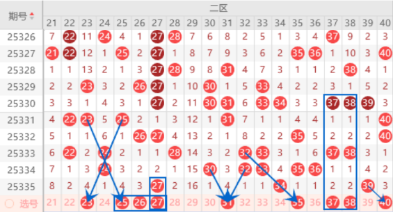 该区间的23 25号数字我们注意一下出一个号码的情况,本期可以防守一下23 26号数字或者25 27号数字同出的情况。连号空一带号30 32 33号数字本期不一定会落号码,所以这里我们防守一下31号数字出号情况就行了。本期的35 36 37 38号数字是属于连号阶梯号码,本期是有机会出一个号码的,其中的35 37号数字我们可以重点关注一下出号情况。本期的40号数字出号机会也是有的,我们可以防守一下37 40号数字同出的情况。