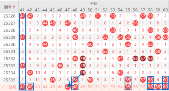 该区间的41 42号数字我们注意出一个号码的情况,本期的41号数字是属于232走势,42号数字是属于171走势,本期出一个号码的机会很大,我们可以重点关注一下。本期的47号数字出号机会也是有的,我们可以防守一下出号情况。上期开出了48 50号数字,本期我们防守出一个重号的情况,本期可以防守一下47 48号数字同出的情况。上期开出了55 57 58 60号数字,本期我们注意一下出重号的情况,其中的55 58 60号数字可以重点关注一下出重号的情况。