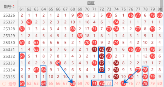该区间的61号数字我们注意一下出号码,本期可以防守一下61 64号数字同出的情况。该区间遗漏10的号码有三个为65 67 75号数字,本期是有机会出一个号码的,其中的65 75号数字我们可以重点关注一下出一个号码的情况。本期的71 72 73号数字是属于重号72号数字的边号回补号码,本期是有机会出一个号码的,我们重点关注一下71 72号数字的出号情况。本期的78号数字我们注意一下走三重的情况,本期可以防守一下75 78号数字同出的情况。