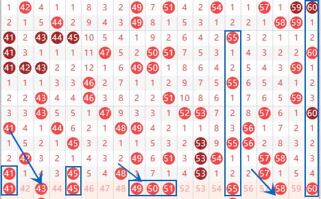 本期的41号数字我们要注意走重的情况,尤其是41 51同出的情况可以关注一下。本期的49号数字是属于空一对称号码,近期出现这种类型的号码有点频繁,所以我们可以关注一下。上期53号数字走出了3重,那么本期的50号数字我们就要注意了。本期的58 60号数字我们要注意一下,这里应该会出一个号码,为下期出59做准备的。