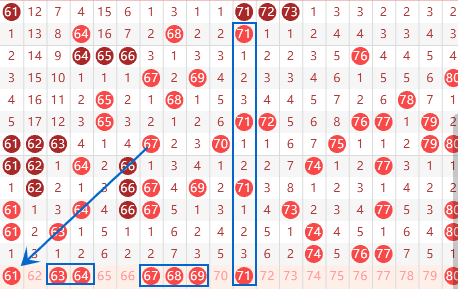 本期的61号数字我们要注意一下,也是属于空一对称出号,如果本期出了,那么下期接着会走重的。本期的63 64号数字我们要注意一下,有出连号的情况。67号数字本期是属于212走势,本期也是可以关注一下。本期的71号数字是属于323走势,我们可以关注一下。