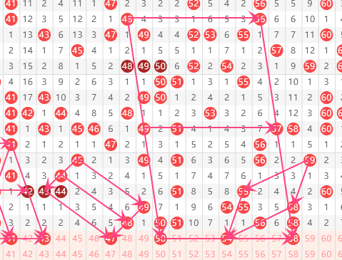 三区分析:【41-60】(走势图标注号码非小黄车大底,请谨慎参考,具体思路
