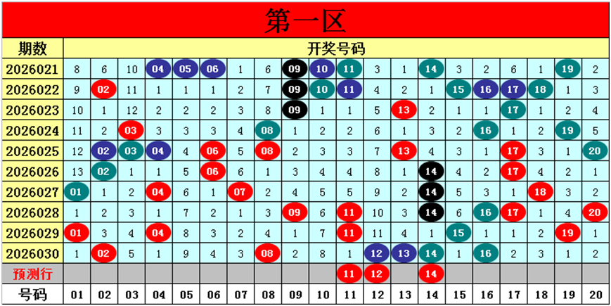 目前第一区包含14个热码:重码6个02、08、12、13、14、16,邻码5个01、09、11、15、17,孤码3个04、19、20;包含4个温码:邻码2个03、07,孤码2个06、18;包含2个冷码:邻码0个,孤码2个05、10;号码冷温热个数比为2:4:14,重号、邻码、孤码个数比为6:7:7。
