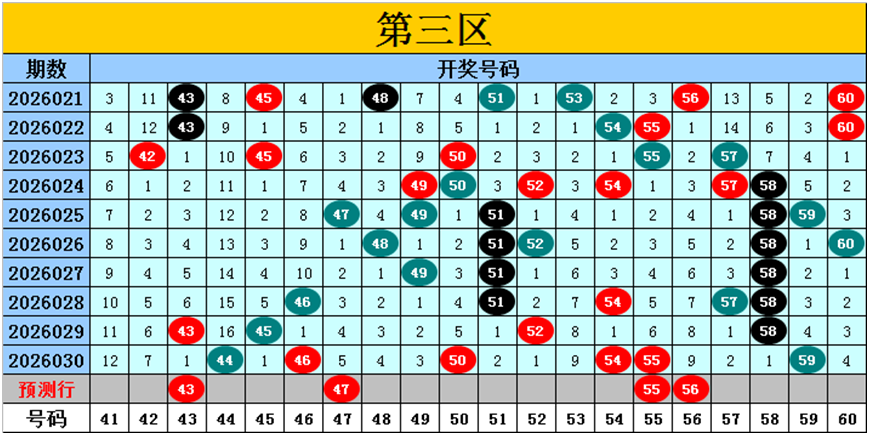 目前第三区包含12个热码:重码6个44、46、50、54、55、59,邻码4个43、45、51、58,孤码2个52、57;包含4个温码:邻码3个47、49、60,孤码1个48;包含4个冷码:邻码2个53、56,孤码2个41、42;号码冷温热个数比为4:4:12,重号、邻码、孤码个数比为6:9:5。