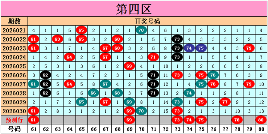 目前第四区包含13个热码:重码4个61、69、70、73,邻码4个62、68、71、74,孤码5个65、66、67、75、77;包含3个温码:邻码0个,孤码3个64、76、79;包含4个冷码:邻码1个72,孤码3个63、78、80;号码冷温热个数比为4:3:13,重号、邻码、孤码个数比为4:5:11。