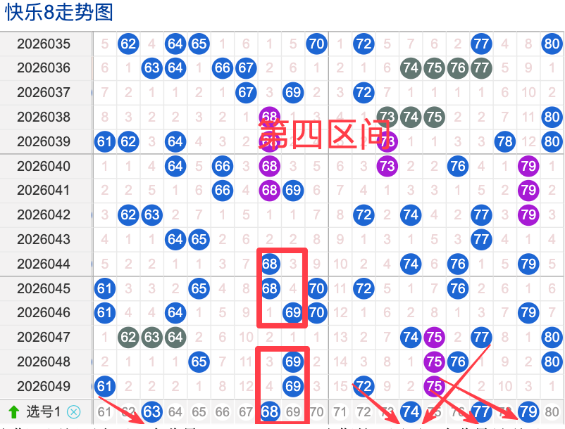 上期四区间开出了4个奖号(61.69.72.75)上期的四区开4个奖号呈现了一个递减趋势,开出的奖号7头回补2个,6头回补2个,先来看号码63在近 30 期内属于还是很稳定的号码,近期出现频率相对较热,偶尔会间隔多期后出现一次,这个号码要注意防守,号码68具有一定的间歇性近期活跃度较稳定比如有时会间隔 7到5期就再次出现,也有时会间隔多期,近期整体出现频率比较热,近期还是要关注的.号码74活跃度近期比较好,有一定的间歇性。活跃度近期较稳定,整体走势有一定的波动性.