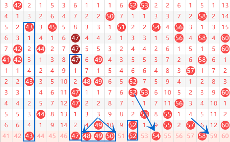 本期的43号数字是属于空4对称号码,我们可以防守一下的。上期开出了49号数字,本期我们要注意分边的情况,所以本期的48 50号数字我们也是要重点关注一下的。本期遗漏9期的号码45 51 54我们也是要注意出一个号码的情况的,尤其是45 54我们可以重点关注一下。上期直播时就说过了,如果55走重,本期我们可以考虑一下50 58的出号情况,本期这里也是我们重点考虑的地方。