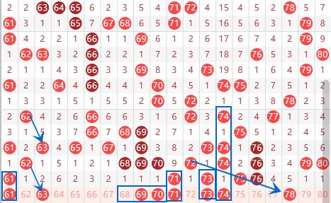 上期开出了连号60 61,本期我们要注意一下出重号的情况,可以考虑一下61号数字出重号的情况。三连号68 69 70号数字本期我们要注意落号情况,本期这里落下一个号码的情况是很大的,可以在这里定一胆码出来。重点考虑一下69 70号数字的出号情况。本期的78 80号数字我们也是要注意的,出一个号码的情况很大。