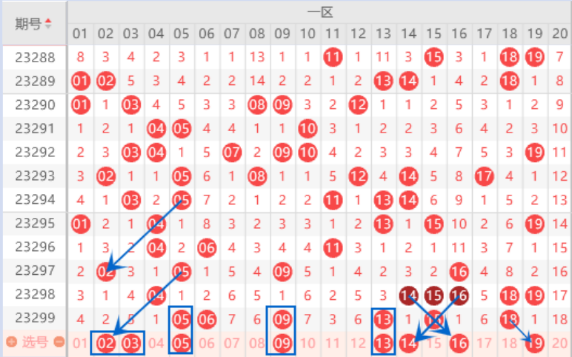 该区间的02号数字我们关注一下,毕竟上期开出了79号数字的重号,很容易把本期的02号数字带出来的。上期开出了连号05 06,本期我们要注意走重的情况。本期的13号数字还是有机会出重号的,13 14 15 16斜连都是重号,我们要注意了。梅花号码14号数字我们也是要防守一下的,出号机会很大。本期的16 17号数字我们要注意出一个号码的情况,这里也是有机会出一个号码的。
