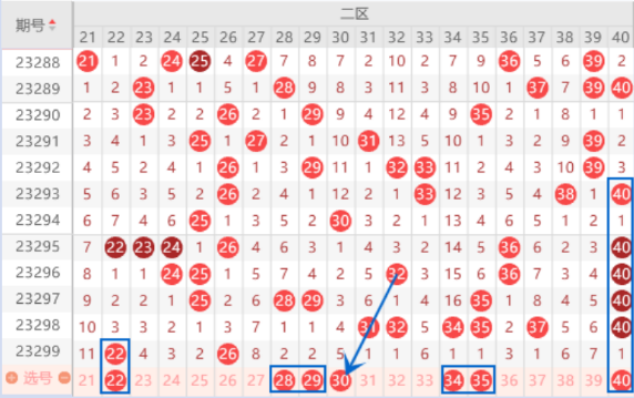 上期开出了孤号22 26,本期我们要注意有一个走重的情况,重点关注一下22号数字出重的情况。本期我们要注意一下连号28 29号数字的落号情况了,阶梯空二出号概率是很大的。连号34 35号数字我们也是要注意的,这里的连号空一带号34 35 37号数字应该也是会回补一个号码。本期的40号数字是属于空一对称号码,我们要注意一下出号情况。