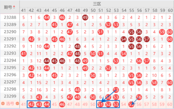 该区间上期开出了了冷号43号数字,本期我们要注意分边的情况,本期的42 44大概率会出一个号码,我们防守一下42 43或者43 44同出的情况。本期的46号数字我们关注一下,属于三斜连号码,出号机会还是有的。本期的夹号49 51号数字我们要防守一下出一个号码的情况。本期的53号数字我们要注意走三重的情况,毕竟上期48 43号数字都出重号了。本期的60号数字我们要关注一下,本期出号机会也是有的。