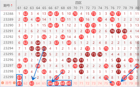 该区间的61号数字我们要注意出重的情况,防守一下61 63同出的情况。本期的66号数字我们防守一下,但是不能做胆码,出号机会不是很大。本期的69号数字我们要重点关注一下了,注意68 69同出的情况。三连号72 73 74号数字本期应该是要落号了吧,我们要注意出一个号码的情况,放在拖里是最合适的,做胆还是有一定的风险的。上期开出了75号数字,本期我们要注意走重的情况,防守一下75 76同出的情况。
