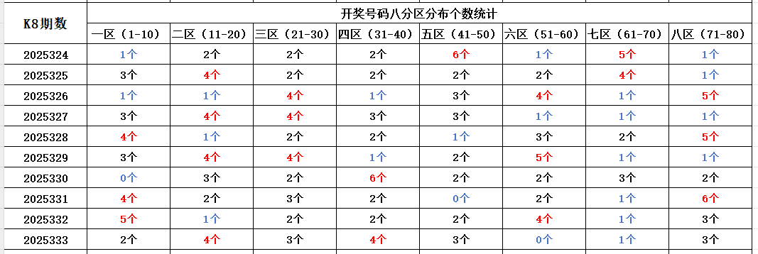 首先看上期回顾,“快乐8”第25333期开奖结果:4.9.11.16.19.20.22.24.28.32.33.37.38.41.46.49.66.71.72.74;通过分析开奖号码,分享第一个数据分析:统计开奖号码的八分区冷热走势,判断出号规律。以近10期开奖号码的八分区统计数据为例: