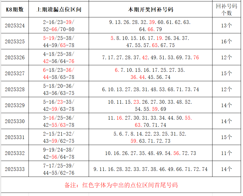 分享第二个数据分析:定位点位区间。上期开奖号码和邻号以外的号码,即为遗漏号码,大概率会在下期回补开出。以近10期回补点位区间的统计数据为例: