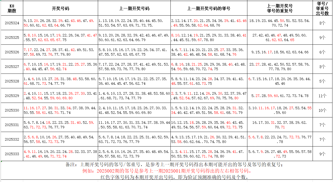 特别提示:关于邻号和邻重号的数据统计,邻号,是指上期开奖号码的左右相邻号码;其中重复出现的邻号,即为邻重号。一定要区分,邻重号不是上期开奖号码的重号,是邻号里的重号。可能新关注的粉丝,还不适应这种统计方法。熟能生巧,无它。统计方法不同,得到的数据结果不同。个人分析,仅供参考。