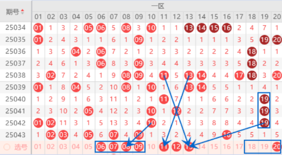 该区间上期开出了03 05 07 09号数字,本期我们要注意出重号的情况,其中的05 07 09号数字我们可以重点关注一下出重号的情况,这里是有机会出2个号码的。本期的夹号06 08号数字我们也是要关注一下的。本期的11 13号数字是属于交叉对称号码,本期是有机会出一个号码的,可以重点关注一下。本期的18 19 20号数字是属于重号19号数字的边号回补号码,本期是有机会出一个号码的,我们重点关注一下18 20号数字的出号情况。
