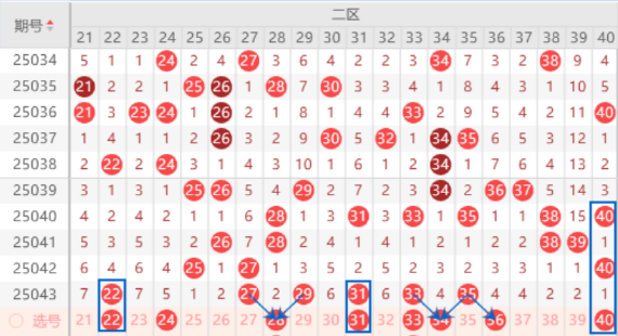 该区间的22号数字我们防守一下出重号的情况。上期该区间开出了27 29 31 33 35号数字,本期我们注意一下出重号的情况,其中的31 33号数字我们可以重点关注一下,这里的夹号28 34号数字我们也会是要关注一下出号情况的。本期的36 37 38 39号数字是属于阶梯号码,所以本期我们先考虑一下36 37号数字落下一个号码的情况。本期的40号数字是属于空一对称号码,我们要注意防守一下出号情况。