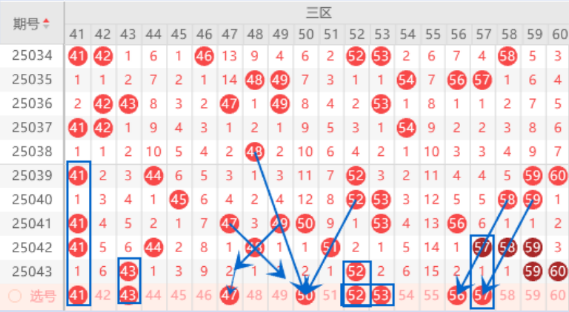 该区间的41号数字也是属于空一对称号码,本期也是有出号机会的,我们可以关注一下41 43号数字同出的情况。本期的47 49号数字是属于交叉对称回补号码,本期我们防守一下出一个号码的情况,如果本期不出,那么下期我们也是可以放弃了。本期的53号数字是属于斜四连号码,本期是有出号机会的,我们可以防守一下52 53号数字同出的情况。本期的56 57号数字是属于连号斜连号码,本期是有机会出一个号码的,我们可以关注一下。