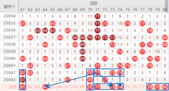 上期该区间开出了61 70号数字的重号,本期我们注意出一个三重号码的情况。本期的71 73号数字是属于交叉对称号码,又是空一交叉对称号码,本期出一个号码的机会是有的,我们可以重点关注一下,本期这里我们可以关注一下70 73号数字同出的情况,如果70 73号数字不出,那么本期的71号数字就可以重点关注一下了。本期的78 79 80号数字我们注意出号码的情况,这里是有机会出2个号码的,我们可以重点关注一下。