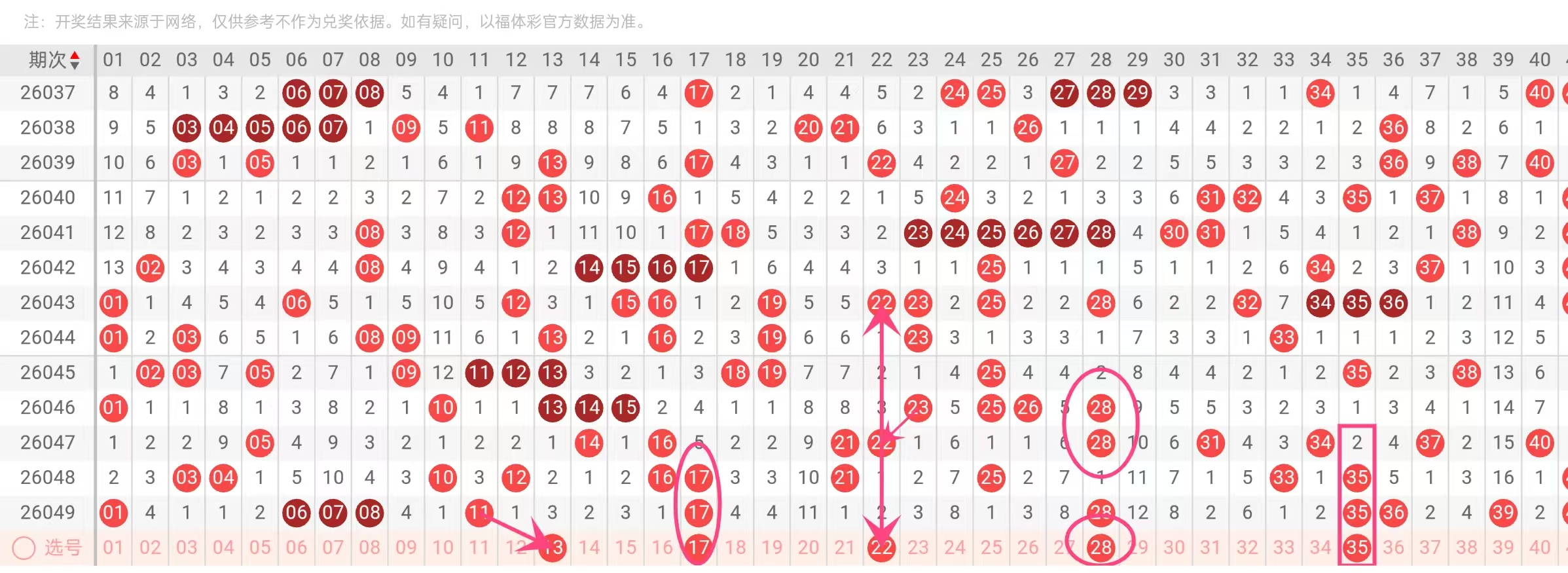 28:在49期、47期、46期均有出现,分布均匀,且常作为区间枢纽,28的稳定性强,适合作为胆码。
