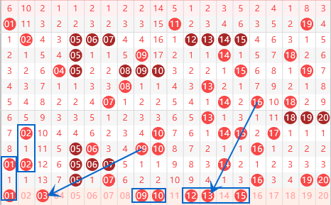 该区间的01号数字我们要注意一下了,本期连号01 02应该会落下一个号码来的。本期的冷号03号数字我们要注意一下,03 05 07 09形成了斜连号码,还是有机会出号的。连号09 10我们要注意一下落下一个号码的情况。本期的13号数字也是属于斜4连号码,我们也是要注意它的出号情况的。本期的12 15 18号数字我们要注意了,它们都是属于2路号码,已经遗漏3期了,本期我们要注意落下号码的情况。