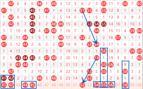 上期开出了三连号40 41 42号数字,本期我们要注意落下一个重号的情况,本期我们重点关注一下41 42号数字的出号情况就行了。本期的52号数字我们可以防守一下,属于三斜连号码,出号机会还是有的。本期的55号数字是空一对称号码,可以做一下防守的。本期的58号数字是属于遗漏9期的空一出号,最近出的比较多,我们可以关注一下。