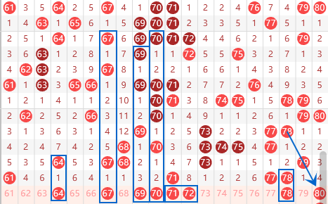 本期的64号数字是属于171走势,我们要防守一下它的出号情况,67号数字是属于151走势,所本期的64 67应该是会出一个号码的,我们要注意了。本期的69号数字是属于123走势,这种走势近期出的也是比较凶的,我们要注意了。本期这里我们要注意一下出现连号的情况,防守一下70 71或者71 72同出的情况。上期开出了77 78连号,本期我们要注意一下落下一个重号的情况。