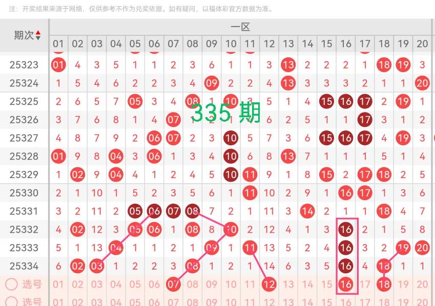 本区间覆盖1-20号,25334期开出5码(02、03、08、16、18),处于均衡水平但存在结构偏差。从路数来看,上期1路号码仅在本区间开出16号,而近10期1路号码在本区间平均每期开出2.3个,当前1路已连续3期低于均值,存在强烈反弹预期。遗漏值方面,12号遗漏16期,远超本区间平均遗漏期的,属于典型冷号,近期冷号回补信号明显;07号遗漏3期,属于温码,其尾数7近期近10期出现多次,尾数热度较高。连号走势上,本区间上期开出02-03连号,近10期本区间连号出现率较高,本期大概率延续连号形态,重点关注13-14、19-20等衔接位。重号方面,16、18号作为上期热号,近5期分别出现4次、3次,具备重号潜力。因此推荐号码:07、12、13、19、20。