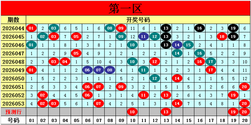 目前第一区包含10个热码:重码5个02、03、07、14、20,邻码3个06、13、19,孤码2个09、11;包含8个温码:邻码3个01、04、08,孤码5个05、10、12、16、17;包含2个冷码:邻码1个15,孤码1个18;号码冷温热个数比为2:8:10,重号、邻码、孤码个数比为5:7:8。
