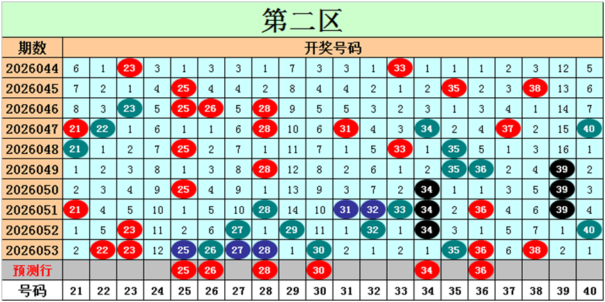 目前第二区包含18个热码:重码10个22、23、25、26、27、28、30、35、36、38,邻码6个21、29、31、34、39、40,孤码2个32、33;包含1个温码:邻码1个37,孤码0个;包含1个冷码:邻码1个24,孤码0个;号码冷温热个数比为1:1:18,重号、邻码、孤码个数比为10:8:2。