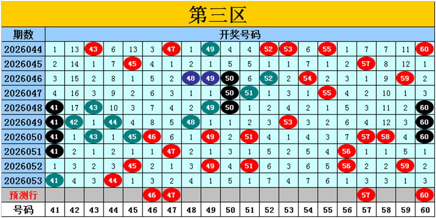 目前第三区包含8个热码:重码2个41、44,邻码1个45,孤码5个47、49、51、56、59;包含10个温码:邻码2个42、43,孤码8个46、48、50、53、55、57、58、60;包含2个冷码:邻码0个,孤码2个52、54;号码冷温热个数比为2:10:8,重号、邻码、孤码个数比为2:3:15。