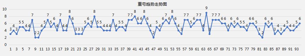上期重号开了6个,小幅上升一位,呈现了两段上升走势,特征明显,且底部是3-3-(4-4)渐次上升,未来看多,本期可能平移一位或小幅上升,预计开5-8个重号。