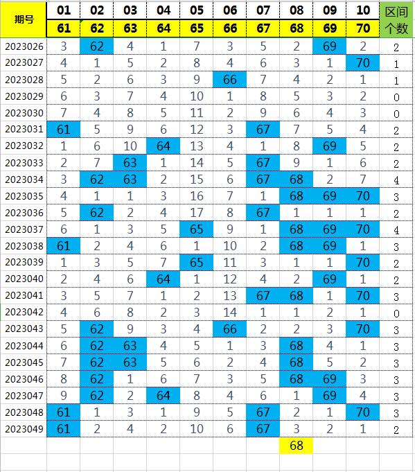 号码68当前遗漏3,前2次开出均是遗漏2,为三底(2-2-3)不对称等间周期,68是在降三浪(12-9-1)完成后连续开出双底等间2周期,当前遗漏3,较有可能在这2期内开出。