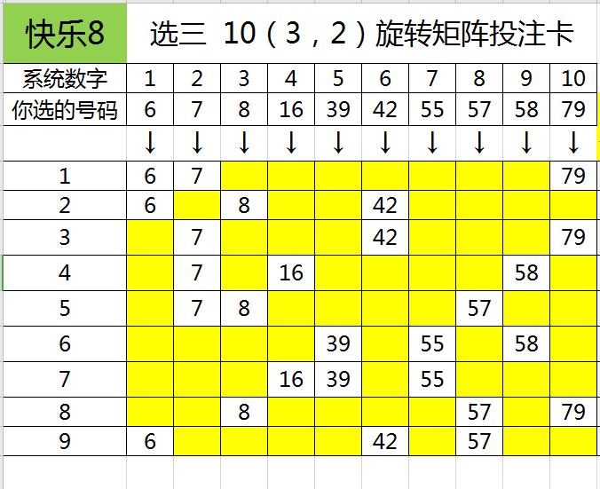 如果选择(06,07,08,16,39,42,55,57,58,79),这10个号码打选三玩法,采用10(3,2)矩阵,每一行为1注共9注,如下: