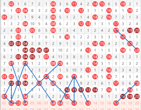 快乐8第069期01-20区域,推荐的第一个号码是0203和04,我们看这组图,首先看02。他和林一之间有个经典的三角夹角走势,同时我们看到上面是04间隔两期给03,再间隔两期给02,同样上面的02间隔两期给03,再间隔两期给04。然后03是个132的走势,所以这个区域考虑02-03-04同时开出。现在就是08号,我们可以看到04间隔2给06,再间隔2给08;08又是个间隔2的对称走势。然后09我们可以看到11间隔一给10,再间隔一给09,然后10到14的5连,下了一个10,拐回来给个11,同时这个11和13形成了上下的一个对称的三角。再往后就是这个17号,大家可以看到上面是20带着19带着18一直给到17,那么下面走势有可能相同。