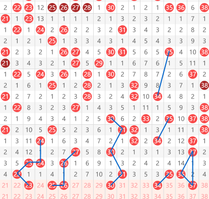 快乐8第069期20~40区域,推荐第一个号码是23,它这个地方的走势就和54那个走势是一模一样的,看着要下52,结果他给了一个23的回掏,所以推荐23下来就是25和26,它的走势就和上面的25斜着,24间隔一给出23.24的走势是一样的。下来是30,这个号码可以看到30和31之间的对称走势。然后就是34,我们看到上面最上面那个35是间隔三七给34。下来间隔两一七给34。那么接下来就是直接带出34的一个走势,最后就是37和36之间的三角夹角关系。