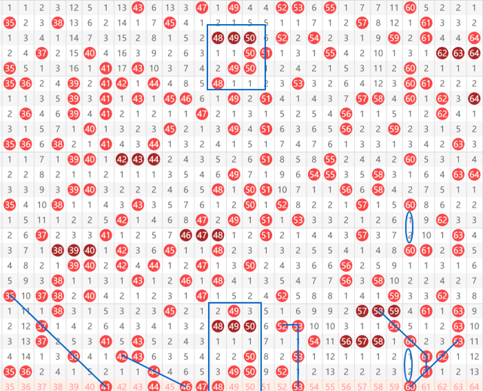快乐8第069期41-60区域:推荐的第一个号码是41号,我们可以看到35,间隔一给37,再间隔一给39,再间隔一给41的。间隔一斜帘以及41本身和42之间形成的一个三角夹角关系,那么下来就是 44昨天是间隔6等距开出,上面是两个,下面考虑继续走重,然后就是46号、47和48这三个号码属于三选二的号码。然后篮筐里都标注,大家可以看到上面是49.50开出了48,那么下面会不会开除48?然后就是53这个走势。最后就是61个间隔2的对称走势。