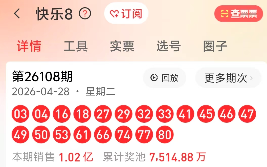 第2026108期 开出3-4-16-18-27-29-32-33-41-45-46-47-49-50-53-61-66-74-77-80