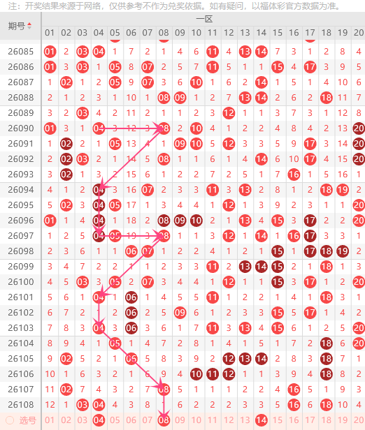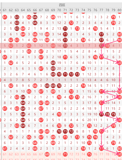 第四区间的走势分析:第四区间上期开出了5个号码球,属于前半区2个,后半区3个码。走出了2奇3偶的形态走势,根据四区间的走势规律,今天的四区间我们主看后半区80这个号码球的落位,根据80的落球规律。重点关注68、80组合