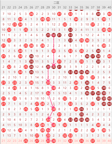 第二区间的走势分析:第二区间上期开出了4个号码球,前半区2个,后半区2个码,走出了3奇1偶的形态走势,根据二区间的走势规律,今天的二区间我们主看前半区29的码,根据29的落球规律,重点关注29、30组合